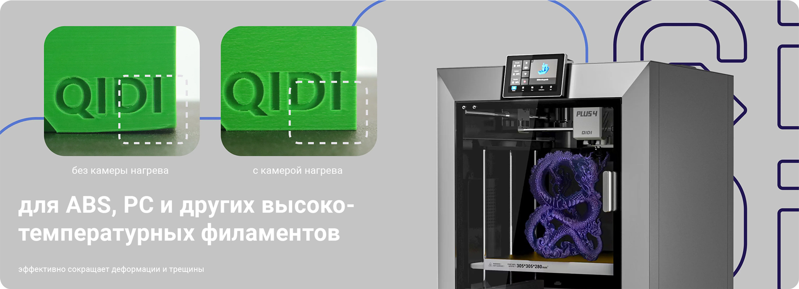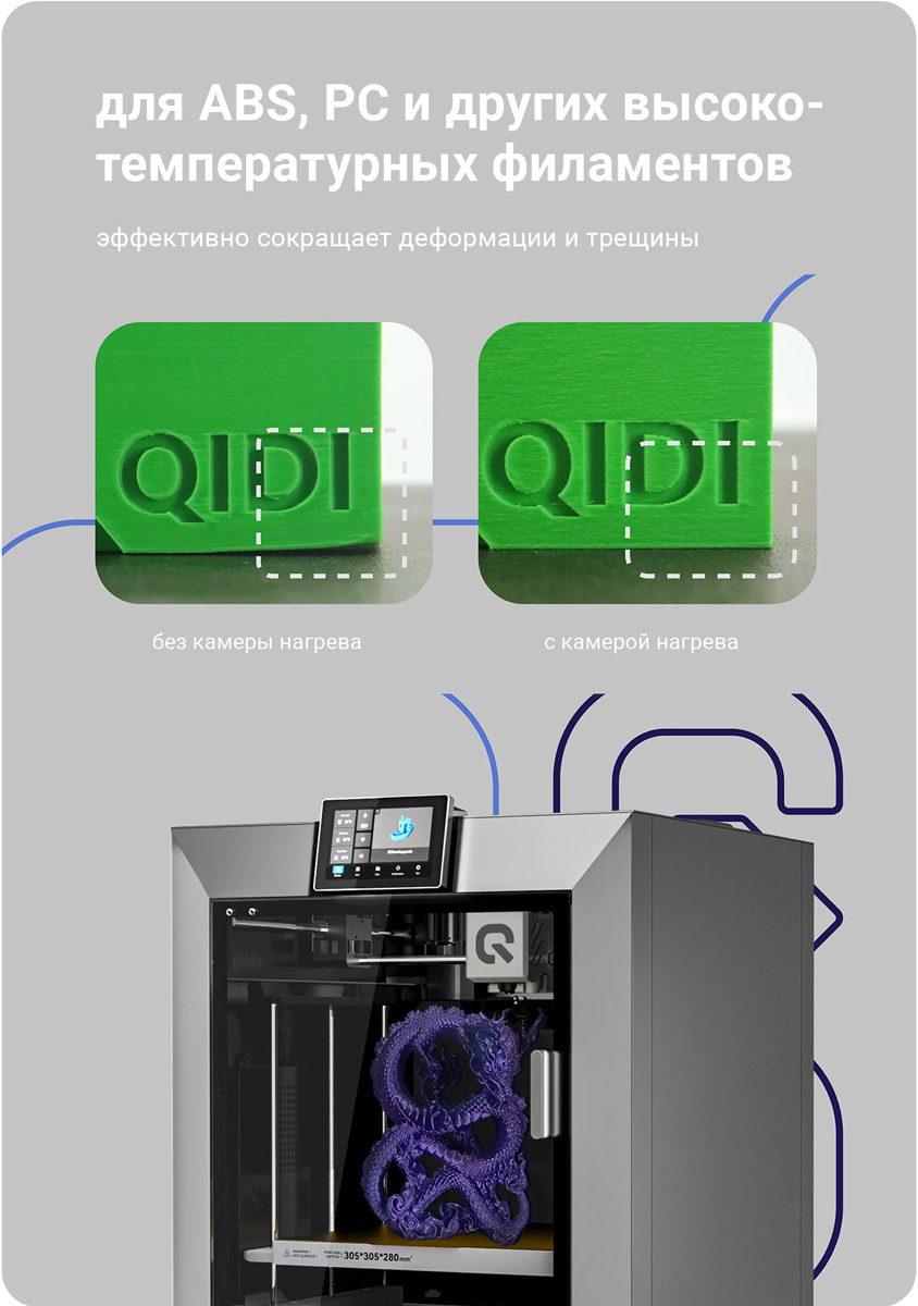 Высокотемпературные филаменты: ABS, ASA, PC, PA, PA-CF/GF, PET-CF/GF, PPA-CF/GF, PPS-CF и т.д. Для достижения оптимальных результатов печати мы рекомендуем использовать высококачественные филаменты QIDI.