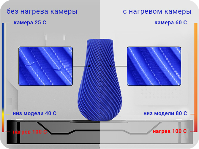 Чем выше температура в обогреваемой камере, тем больший диапазон материалов может быть напечатан.